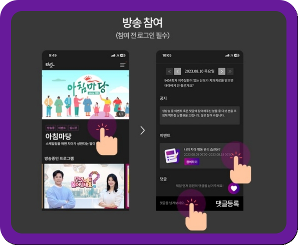 3. 아침마당 배너 클릭: 메인 화면에서 아침마당 배너를 클릭합니다. 이 배너는 보통 화면 상단에 위치해 있습니다.