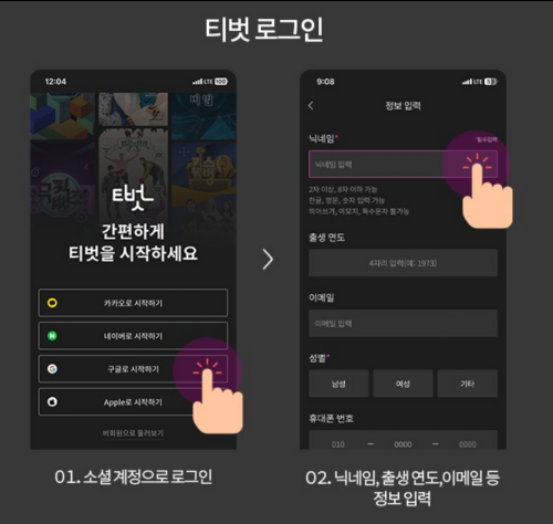 회원가입: 앱을 실행한 후 카카오, 네이버, 구글, 애플 아이디로 로그인할 수 있습니다. 이후 닉네임, 출생연도, 성별, 이메일, 휴대폰 번호를 입력해서 회원가입을 완료합니다.